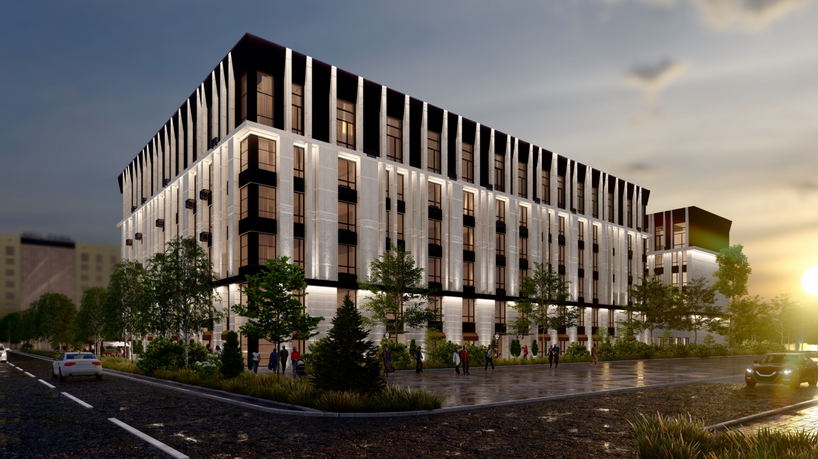 Элементы освещения интегрированы в архитектурный дизайн, чтобы подчеркнуть красоту комплекса в вечернее время.