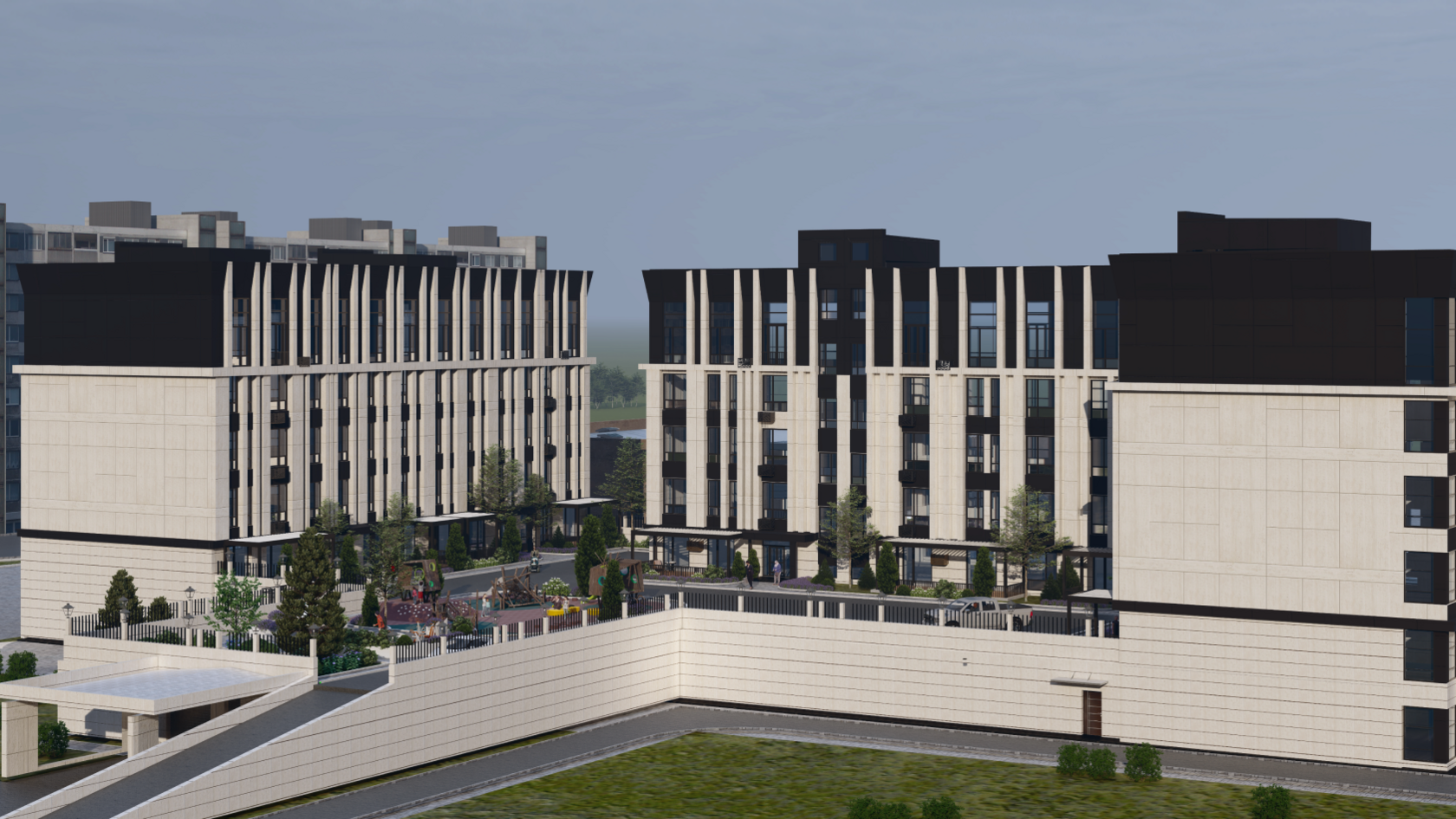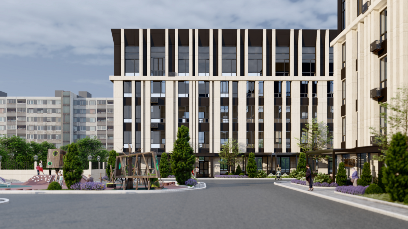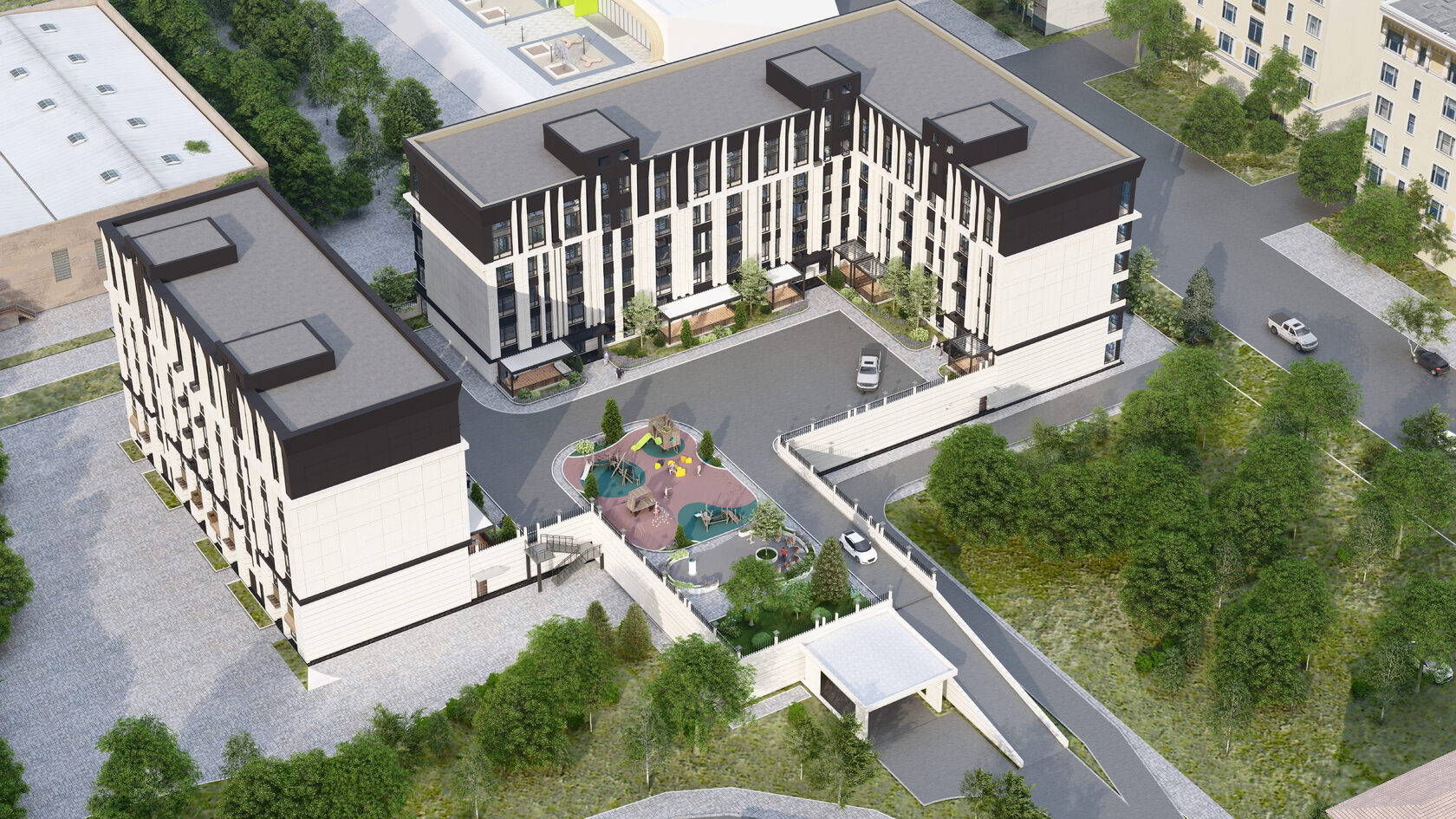 Комплекс гармонично вписывается в престижный район Караганды, подчеркивая его элитный характер.